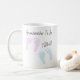 Surpreende a "avó a ser" de gêmeos ao anunciar a gravidez com um adorável design com pegadas de bebê azul e rosa em ambos os lados da caneca. Personalize o texto no campo modelo para alterá-lo em ambos os lados ou remover qualquer texto.