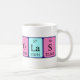 Nickolas soletradas como Ni C K O La S (Nickel Carbon Potássio Oxygen Lanthanum Sulfur) numa caneca para o cientista em si.