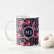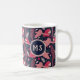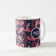 Ara Parrot Red Pink Desenhando Pão Tropical Pasta Monograma Mug. Padrão de ara sobre fundo azul escuro com folhas tropicais em cores verde, vermelha e bege. Ilustração desenhada à mão digital. Adicione seu monograma.