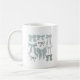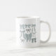 Caneca branca e caqueta com ilustração desenhada à mão de arcos azuis.