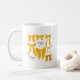 Caneca branca e caqueta com ilustração desenhada à mão de arcos amarelos.