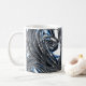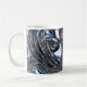 Arctic vortex coffee mug with black, gray, and icy blue abstract swirl artwork. 11 oz ceramic cup, glossy, microwave and dishwasher safe—perfect for gamers, coders, and modern desk decor.