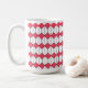 Esta caneca tem um design de arte de hexágonos brancos com uma linha preta no meio e diamantes rosa.