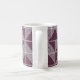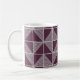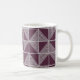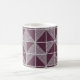 This mug has an art deco design of squares divided in half by diagonal lines of silver. The squares are then pieced together on a field of purple.