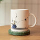 Uma caneca artística branca de arte original única, de arte branca, apresentando um poema visual numa paleta de cor azul, castanha e bege com um pouco de folhagem verde. O trabalho de arte é um poema visual que foi originalmente publicado no Volume I da série Diamond Dust Poems From the Black Sea. Você pode personalizar facilmente a cor de fundo ou adicionar qualquer texto ou imagem desejada. O arranjo costeiro apresenta os triunfos de Guildfordia ou a casca de turbo-estrela triunfante.
