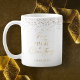 Design de caneca de café de Natal sazonal moderna, com uma design de árvore de Natal que diz "Acredite na magia do Natal" num ouro falso com efeito brilhante dourado à volta da jante e fundo branco. Personalize com seu nome ou texto personalizado e faça o arquivo ou presente perfeito para você ou para um ente querido.