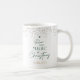 Design de caneca de café sazonal moderna, apresentando um design de árvore de Natal que diz "Acredite na magia do Natal" em verde-pinheiro com efeito brilhante dourado ao redor da borda e fundo branco. Personalize com seu nome ou texto personalizado e faça o arquivo ou presente perfeito para você ou para um ente querido.