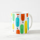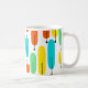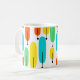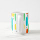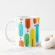 Esta caneca tem uma design moderna do século médio de longas ovais em amarelo, laranja, verde e turquesa com linhas pretas com círculos nas extremidades.
