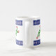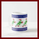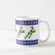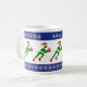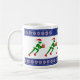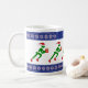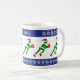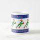 Esta caneca mostra cinco figuras de natal, correndo e carregando presentes. Estão em forma de pictograma, verde, e vestindo chapéus e botas festivos. Acima e abaixo está uma banda azul marinho com um padrão estilizado de flores de poinsettia, combinando cores de natal de vermelho, branco e ouro. Você também pode personalizar a caneca adicionando um nome ou iniciais.