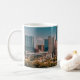 Esta caneca apresenta uma impressionante vista aérea da Avenida Austin e do Congresso e o nome da cidade em caracteres brancos elegantes.