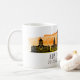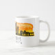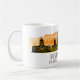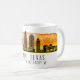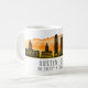 design de caneca de café na moda apresenta silhueta de linha do horizonte da cidade de Austin Texas com abertura de cor d'água e coordenadas de mapa de latitude e longitude