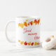 O outono de Cozy deixa uma caneca de café com cores quentes de queda. As folhas são posicionadas apenas ao longo das bordas e cantos, deixando um centro limpo e aberto. Uma caneca perfeita para café, chá ou chocolate quente e um presente sazonal ideal.