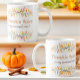 Esta caneca básica apresenta bordas superiores e inferiores de membros cruzados com folhas coloridas do outono e uma mensagem de texto "PUMPKIN SPICE" é definitivamente minha vise! em ambos os lados da alça. Personalize a mensagem nos campos de texto ou remova o texto que a alteração ocorrerá em ambos os lados do identificador.