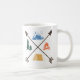 Um legal design para aventureiros, com uma montanha, fogueira, árvores e tendas com duas setas.