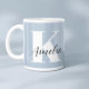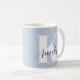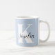 Caneca azul-clara personalizada que apresenta seu monograma inicial em uma tipografia branca moderna e grande e seu nome em um script de na moda.