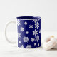 Um presente de época natalícia sóbrio agradável por suas manhãs de Natal ou lanche com flocos de neve brancos em um fundo azul. Customizável. Escolha seu estilo da caneca. Outro colore gravatas disponíveis, assim como combinando, cartões, convites, ornamento cerâmicos da árvore, etiquetas, etc.