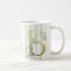 Letra B, ouro inicial com folhagem azul de aquarela em tiras azuis e brancas, caneca inicial. © Julie McIver