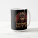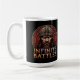 Um design ousado e dinâmico que apresenta o texto "Batalhas Infinitas" em uma paleta tradicional de cor Viking de vermelho e ouro. As palavras são dispostas em um estilo poderoso, angular, reminiscente de antigas cordas. O fundo é uma superfície texturizada, meteorizada, acrescentando um senso de autenticidade e significado histórico.