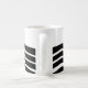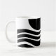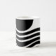 Esta caneca tem design Bauhaus de linhas onduladas e círculos a preto num campo de branco.