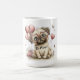 A whimsical illustration featuring a sweet pug wearing heart-shaped glasses, surrounded by pink heart balloons and fluttering butterflies. The playful script “Be Mine!” adds a romantic touch, making this design perfect for expressing affection with charm and humor.