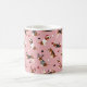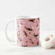 Gaivotas bonitas vestidas em roupas festivas de férias, chapéus de Santa e blusas de argila com Enfeites de natal dispersos em fundo rosa.