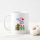 Uma caneca de café com minha design de um personagem de castor está segurando um cartaz que diz "Eu coração Alberta".
