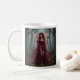 Uma bela fada vestindo um vestido vermelho que flui e um colar e cinto feitos de granadas com cravos e garnets em seu longo cabelo vermelho-escuro e asas leves do tipo libélula vermelha segurando um cravo vermelho em cada mão caminha por uma floresta mágica cercada por vagalumes, flores e árvores cobertas de mosca.