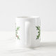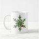 Caneca de Natal com uma colagem que mostra um belo floco de neve feito de galhos de pinheiro. Uma bola de Natal vermelha está pendurada num dos ramos do pinheiro.