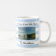 Bem-vindos à sua casa no lago, nome da família, caneca fotográfica. Fotos de listras brancas azuis. Adicione suas próprias fotos, texto e nome para personalizar a caneca.