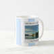 Bem-vindos à sua casa no lago, nome da família, caneca fotográfica. Fotos de listras brancas azuis. Adicione suas próprias fotos, texto e nome para personalizar a caneca.