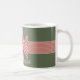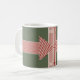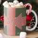 A bold geometrical striped large bow running around a mug as if gift wrapping it, with customizable text forms a perfectholiday gift.