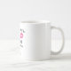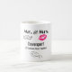 Uma caneca personalizada para um aniversário de casamento com um design de tendências - lábios de kissy cor-de-rosa glamourosos e uma ilustração de bigode retrógrada masculina. Palavras retrógradas dizem que Sr. e Sra. e você pode personalizar com seu nome e anos juntos.