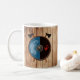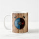 Um escudo Viking e eixos de batalha cruzados sobrepostos a uma imagem de fundo de uma prancha de madeira. O escudo é preto no lado esquerdo com um impressão vermelho direito. O outro lado da blindagem é azul com uma águia branca no estilo Celtic-Norse. Personalize adicionando seu próprio texto no lado oposto. Os escudos viking variaram. Baseei-me em exemplos históricos. Os escudos às vezes estavam cobertos de couro, assim como este. Como resultado, a tinta é imperfeita, o que permite ver uma sugestão do couro subjacente. As bordas de ferro eram raras; optei pela cobertura de couro, como era frequentemente utilizado. Eu optei por cabeças de machado simples em vez do machado de barba e interpretações mais fantasiosas que são comumente empregadas por artistas.