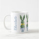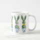 This Easter ceramic mug features cute bunny rabbit green topiaries with pink and yellow bows in blue and white chinoiserie flowerpots. Personalize with your choice of name or special holiday message. Great for Easter baskets and gift bags.