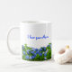 Amo-te, mãe, caneca azul. Os arbustos/arbustos Hydrangea que crescem no jardim são a imagem ao longo da parte inferior, com uma redação azul em ambos os lados.