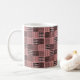Esta caneca tem um design Boho de quadrados com padrões em preto e rosa.