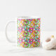 Esta caneca tem um design geométrico de três círculos aninhados e espalhados pelo design em várias cores.