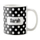 Uma caneca de bolinhas preta personalizada impressa com seu nome! É projetado com um padrão de bolinhas brancas sobre uma cor preta de fundo que envolve a caneca. Seu nome, quando personalizado, é impresso em ambos os lados da caneca sobre o padrão de bolinhas preta. Ele faz um presente de excelente para qualquer um que ama padrões bolinhas e bebidas preto e branco.