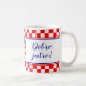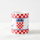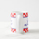 Esta caneca azul combo marinho apresenta uma saudação croata "Dobro jutro!" de um lado e a versão inglesa "Good day!" do outro lado. Há duas linhas de verificadores vermelhos e brancos, assim como faixas finas vermelhas, brancas e azuis na parte superior e inferior do padrão verificado. O texto é personalizável, e a letra azul da caligrafia corresponde à cor da bandeira croata. No meio, há o casaco de braços (grb em croata). Excelente de presente para croatas bilíngues.