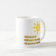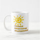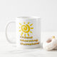 Uma espiral amarela brilhante para o sol em cada canto. As palavras Bom dia Sol brilhando em gradiente amarelo brilhante a laranja. Uma caneca de café perfeita para trazer um pouco de alegria com o café da manhã.