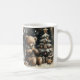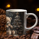 Aproveite esta adorável caneca de Natal "urso-ry" para si mesmo ou para dar presente. Esta design de "Bonito Urso de Teddy" fica perto de uma pequena, decorada, árvore de Natal coberta por neve com uma estrela de ouro e bolas. Ele veste um cachecol xadrez, e na distância negra escura você pode ver flocos de neve caindo. Escrita de Natal no meio.