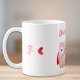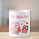 Uma caneca bonita para a melhor mãe de todos os tempos! A frente da caneca apresenta "Melhor Mãe Nunca" (personalizável por você) em um roteiro rosa contemporâneo e uma aquarela de uma coruja-mãe com seu filho e corações cor-de-rosa. Nas laterais da caneca, você pode personalizar com um nome (ou nomes) sob um coração cor-de-rosa coordenador.