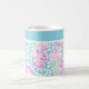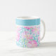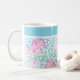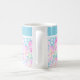 Uma Mug branca de café muito bonito, com um padrão de rosas cor-de-rosa sobre fundo azul-céu, pontilhada com borboletas brancas: de um design de aquarela pintada à mão por Judy Adamson. Você pode adicionar texto à banda simples no topo ou simplesmente deixá-la simples.