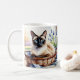 Traga o charme do gato siamês para sua mesa com esta caneca elegante. A caneca é ilustrada com um adorável gato siamês em estilo aquoso, em ambos os lados da caneca. O felino giro se senta em uma cesta mais vacilante por uma janela com vistas no interior, em frente a um vaso de flores azuis. O gato tem pelo macio e olhos azuis gritantes. A caneca bonito é uma adição atraente à cozinha, ideal para amantes de gatos.