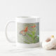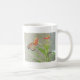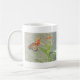 Uma borboleta Monarca, laranja e negra, bebe néctar de uma floração Tropical Milkweed. Na mesma planta, uma lagarta monarca, come as folhas da planta hospedeira preferida.