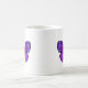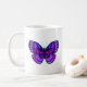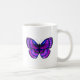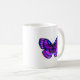 design de uma borboleta com padrões de cor azul e roxo e elementos ornamentais nas asas de uma caneca de café.