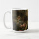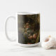 pintura botânica vintage de três pavões num jardim inglês cercado por flores pastel