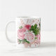 Um grande buquê de belos rosas cor-de-rosa e pincéis com folhas verdes e folhagem dourada faz uma linda Mug.