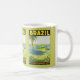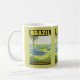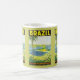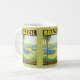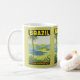 poster de viagens vintage para o Brasil, mostrando a Montanha Sugarloaf do Rio de Janeiro e a Baía de Guanabara.