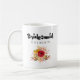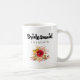 Uma caneca personalizada - obrigado presente para uma dama de honra. Projetado com um bonito buquê floral com pequenas posições em vermelho e amarelo, acentuado com folhas cor-de-rosa e marrom. Texto diz: Bridesmaid escrito em uma fonte legal manuscrita. Personalize com o nome da sua dama de honra, Design é colocado nos lados esquerdo e direito da xícara.